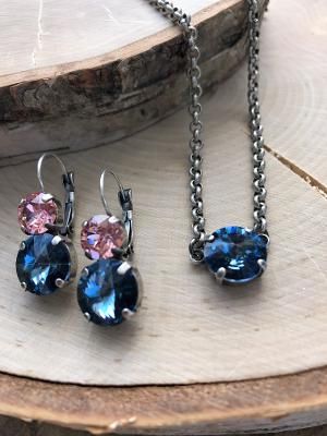 Pink or Blue Crystal NecklaceProduct Details:Metal: Plated in Antique SilverStones; Swarovski CrystalsClasps: Lobster Clasp Closure18" 12MM Cushion Cut Stone NecklaceAntique Silver Chain3" Extender